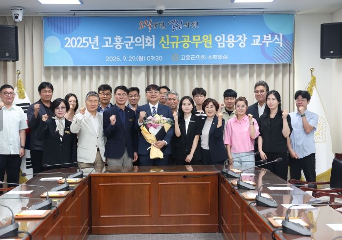 [한국기자연대] 고흥군의회는 소회의실에서 2025년 9월 29일 자 인사발령에 따른 신규 공무원 임용장 교부식을 가졌다.