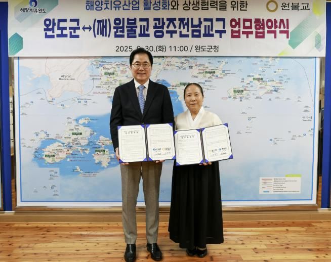 [한국기자연대] 완도군이 완도 해양치유산업 활성화를 위해 (재)원불교 광주전남교구와 업무 협약을 체결했다.