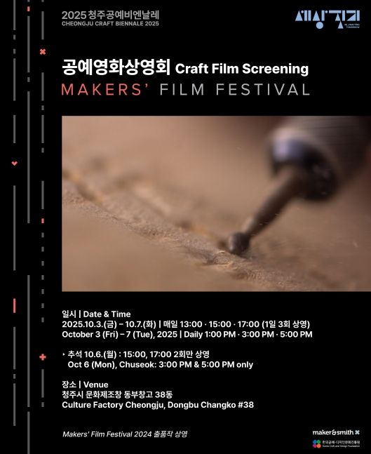 이번 상영회는 조직위와 한국공예·디자인문화진흥원이 협력한 전시연계 프로그램으로, 서호주 기반의 공예 전문 단체 ‘메이커 앤 스미스’가 주최하는 공예영화제 ‘메이커스 필름 페스티벌(Makers’ Film Festival)’의 2024년 출품작을 만날 수 있는 기회다.