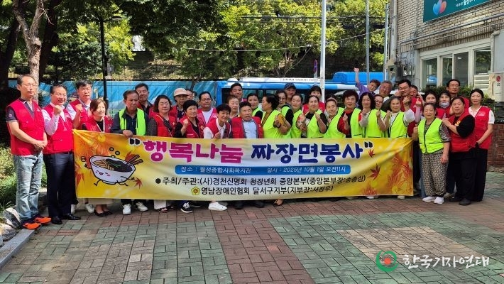 이번 짜장면 봉사는 전성건 회장을 비롯 밀양당말리 당산 보존회 회장 혜심 선생을 비롯 진제스님, 그리고 (사)전통민속문화재단 김순연 이사장 등 20여명과 영남장애인협회 달서구지부 회원 및 월성종합사회복지관 직원들이 참여해 어르신·장애인 등 300여 명을 모시고 무료 짜장면 봉사활동을 진행했다.