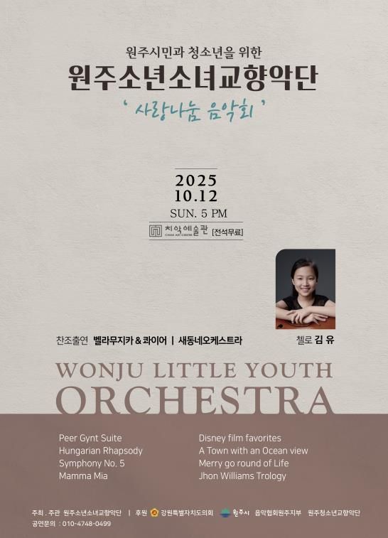 [한국기자연대] 원주소년소녀교향악단은 오는 12일 오후 5시, 치악예술관에서 ‘사랑나눔음악회’를 통해 지역사회와 함께하는 따뜻한 무대를 마련한다.