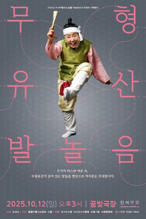 10월 12일 오후 3시 성북구 꿈빛극장(성북구 길음로7길 20 서울성북미디어문화마루 4층)에서 펼쳐지는 국가무형유산 발탈 예능보유자 조영숙 명인의 '무형유산 발놀음'이다. 성북구청 외에도 국가유산청과 국가유산진흥원, 성북문화원이 후원했다.