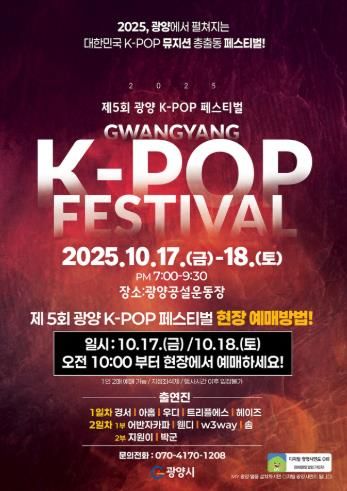 이현주 관광과장은 “제5회 광양 K-POP 페스티벌은 음악과 문화, 관광이 어우러지는 복합문화축제로, 광양공설운동장은 관객의 함성과 열기로 가득 찬 생동감 넘치는 현장이 될 것”이라며 “시민과 관광객 모두가 함께 즐기고 안전하고 품격 높은 축제로 자리매김할 수 있도록 준비에 최선을 다하겠다”고 말했다.