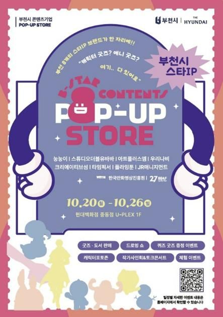 [한국기자연대] 부천시는 10월 20일부터 26일까지 현대백화점 중동점 U-PLEX 1층에서 지역 우수 콘텐츠 기업 8개 사가 참여하는 팝업스토어 ‘8 CONTENTS, ONE STAGE in BUCHEON’을 운영한다.