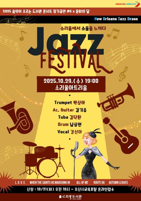 [한국기자연대] 경기도 오산시는 오는 10월 29일 오후 7시, 소리울도서관 3층 소리울아트리움에서 '2025 음악이 흐르는 도서관 콘서트 정기공연 #6 × 문화의 달 – Jazz Festival; 소리울에서 소울을 느끼다'를 개최한다고 밝혔다.