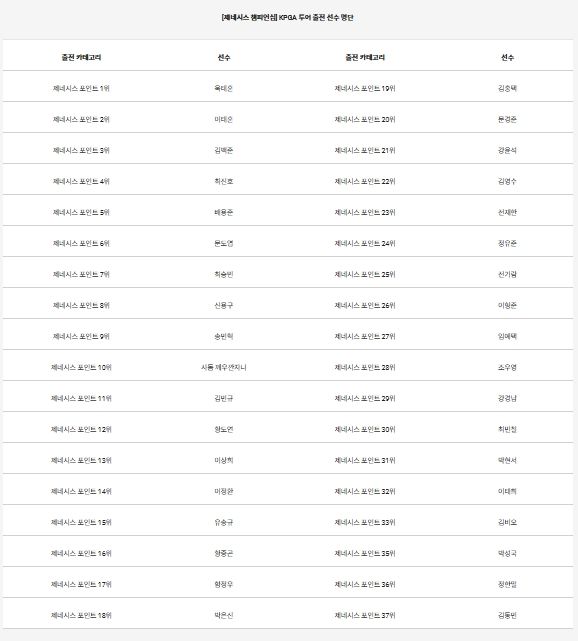 제네시스 포인트 1위 옥태훈(27.금강주택)을 비롯해 2위 이태훈(35.캐나다), 3위 김백준(24.속초아이), 4위 최진호(41.COWELL), 5위 배용준(25.CJ), 6위 문도엽(34.DB손해보험), 7위 최승빈(24.CJ), 8위 신용구(34.금강주택), 9위 송민혁(21.CJ), 10위 사돔 깨우깐자나(27.태국)까지 제네시스 포인트 TOP10 선수들과 36위 정한밀(34.경희), 37위 김동민(27.NH농협은행)까지 제네시스 포인트 상위 36명이 참가자 명단에 이름을 올렸다.