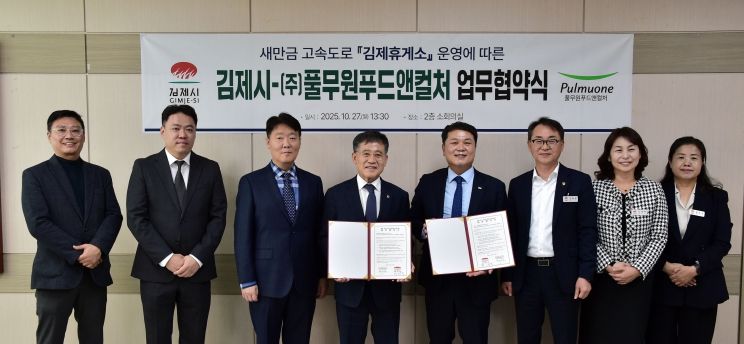 [한국기자연대] 김제시는 27일 ㈜풀무원푸드앤컬처와 '새만금전주간' 고속도로 개통에 따라 새롭게 조성되는‘김제휴게소’운영에 따른 업무협약을 체결했다고 밝혔다.