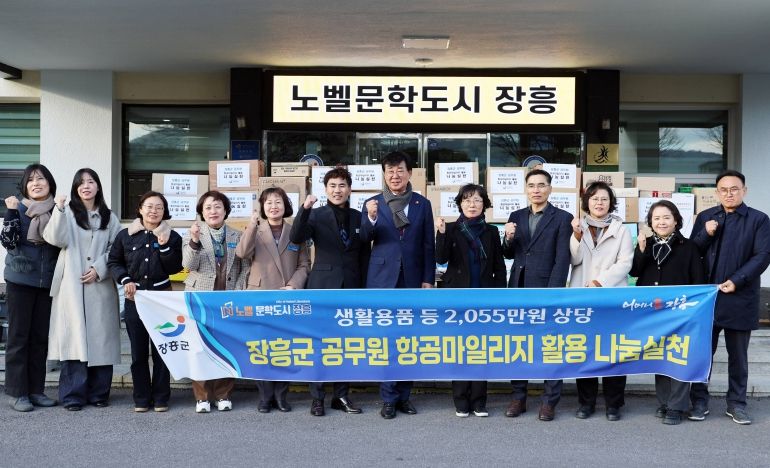 [한국기자연대] 장흥군 공무원 122명이 공적 항공마일리지를 활용해 마련한 20,558,250원 상당의 생필품 197점을 지역 취약계층에 전달했다.