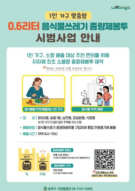[한국기자연대] 서울 송파구가 전국 지방자치단체 최초로 1인 가구에 최적화된 0.6ℓ 규격의 음식물쓰레기 종량제봉투를 오는 10일부터 시범 도입해 운영한다고 알렸다.
