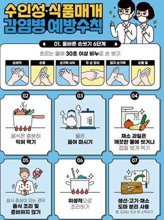 수인성⦁식품매개 감염병을 예방하기 위해서는 △흐르는 물에 비누로 30초 이상 올바른 손씻기, △음식은 충분히 익혀먹기, △구토, 발열, 설사 증상이 있는 경우 음식 조리하지 않기 등 예방수칙을 준수해야 한다.