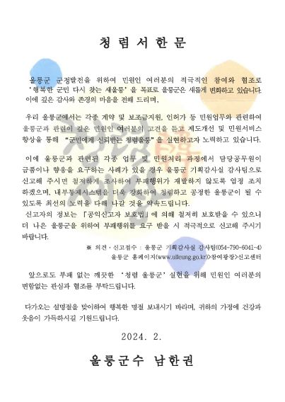 [한국기자연대] 울릉군은 다가오는 설 명절을 맞아 2024. 2. 5.부터 군민으로부터 신뢰받는 공직문화 조성의지를 담은 청렴서한문을 계약·인허가 분야 등 업체 대표와 민원인 300여명에게 발송했다.
