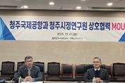 [한국기자연대] 청주시정연구원과 한국공항공사 청주공항 은 1일 청주공항에서 지역 교통·관광·산업 활성화 및 공항 운영 기능 강화를 위한 상호 협력 업무협약(MOU)을 체결했다. 이번 협약은 두 기관이 보유한 인적·물적 자원을 활용해 지역 정책 연구 역량을 강화하고, 공항과 지역 간 연계 수준을 높여 상호 발전을 도모하기 위해 마련됐다. 협약의 주요 내용은 지역 교통·관광·산업 활성화 정책 연구와 공항 운영 여건 개선 및 기능 강화 협력 등으로 공항–지역 연계 정책·사업 기획 및 공항 서비스 품질 향상 조사·연구 등에 폭 넓게 쓰일 예정이다. 원광희 청주시정연구원장은 “충청메가시티 관문으로서 청주공항이 단순히 게이트웨이로서의 역할을 넘어 도시의 고부가가치를 창출하는 데 일조할 수 있도록 협력 연구를 추진하고 시민 체감 성과를 도출하는 데 힘쓰겠다”고 말했다. 두 기관은 이번 협약을 계기로 공동 연구과제 발굴, 협의체 운영 등 실질적 협력 활동을 지속적으로 추진해 나갈 계획이다.