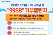 [한국기자연대] 광주광역시 서구가 오는 20일부터 11월 6일까지 18일간, 치매 인식 개선과 기부문화 확산을 위한 ‘1보1원, 한마음 치매극복걷기 9988 기부챌린지’를 진행한다. 이번 챌린지는 치매상담콜센터 홍보와 함께 주민 참여를 통해 치매 극복에 대한 지역사회의 관심을 높이기 위해 기획됐다. 치매상담콜센터는 연중무휴로 전문상담사가 맞춤형 상담을 제공하는 서비스로 ‘18세 기억을 99세까지, 99세까지 팔팔(88)하게’라는 의미를 담고 있다. 참가자는 ‘워크온(Walk On)’ 앱을 활용해 하루 평균 9988보를 달성할 경우 ‘1만원 기부권’을 받을 수 있으며 챌린지 종료 후 만족도 조사와 기부 동의 절차를 완료하면 기부권이 서구 관내 취약계층 치매환자 가구에 전달된다. 서구는 총 300명의 챌린지 달성자를 목표로 하며 누적 기부금 300만 원은 치매환자 30가구에 각 10만 원씩 전달할 예정이다. ‘9988 챌린지’ 참여가 어려운 주민은 하루 동안 1만보를 걷고 1만 원을 기부하는 ‘1보1원 순수기부’에 참여할 수 있다. 김이강 서구청장은 “치매는 개인의 문제를 넘어