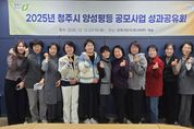 [한국기자연대] 청주시는 지난 12일 충북시청자미디어센터 대회의실에서 2025년 청주시 양성평등 공모사업 성과공유회를 개최했다. 이번 성과공유회는 2025년 청주시 양성평등 공모사업에 참여한 8개 단체가 함께 참여했으며, 단체별로 올 한해 추진한 양성평등 공모사업에 대한 성과를 발표하고 사업 추진 결과물을 공유했다. 또한 2026년 양성평등정책 신규사업을 제안하는 시간을 가졌으며, 발굴한 사업은 내년도 청주시 양성평등 공모사업 추진에 참고할 계획이다. 시는 공모를 통해 8개 사업을 선정해 4월부터 기록으로 보는 청주 여성의 삶 및 여성사, 양성평등 문화확산, 여성복지 및 권익 증진 등 다양한 분야의 사업을 추진해 왔다. 김옥선 여성가족과장은 “청주시 양성평등 정책 실현을 위해 사업을 추진해 주신 단체에 감사드린다”며 “모두가 행복한 양성평등 청주가 실현되도록 앞으르도 많은 관심과 참여를 바란다”고 말했다.