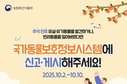 [한국기자연대] 추석 연휴 유실·유기동물을 발견하거나, 반려동물을 잃어버렸다면 국가동물보호정보시스템에 신고·게시해주세요! ■ 추석 연휴 유실·유기동물 구조 통합 신고시스템 운영으로 신속한 온라인 신고·접수 가능 · 기간: 2025.10.2.(목)~10.10.(금) · 신고 게시: 국가동물보호정보시스템 누리집 팝업창 ■ 유실·유기동물 온라인 신고·접수 방법 ① 유실·유기동물을 발견한 경우 국가동물보호 정보시스템 '동물발견' 배너 클릭 → 발견장소, 사진, 개체 특징 등 제보 등록 → 해당 지자체 보호센터 정보제공 → 지자체 동물보호센터 신속 대응 ② 반려동물을 분실한 경우 국가동물보호 정보시스템 '동물분실' 배너 클릭 → 반려동물 분실장소, 일시, 사진 등 정보 등록 → 시민 간 발견 정보 공유(댓글 창 활성화) → 필요시 분실신고 병행(등록동물 정보 변경) 유실·유기동물 구조 통합신고로 보호자를 빠르게 찾아드리겠습니다