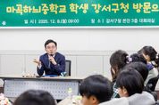 [한국기자연대] 진교훈 서울 강서구청장이 8일 구청 대회의실에서 마곡하늬중학교 3학년 학생들과 직접 대화하며 소통하는 시간을 가졌다. 구는 행정이 어떻게 이뤄지고, 공무원이 어떤 역할을 하는지 학생들이 현장에서 직접 체험하며 이해할 수 있도록 이날 자리를 마련했다. 3학년 1반과 4반 학생 40여 명이 구청을 찾아 진 구청장과 만났다. 진 구청장은 “구청에 직접 와보니깐 어때요?”라고 질문을 하며 대화를 이끌어갔다. 학생들의 장난스러운 질문에도 유쾌하게 답변했고 대화 내내 웃음이 끊이지 않았다. 길거리 흡연 등 생활불편부터 강서구의 주요 정책과 예산 규모, 10년 후 강서구에 필요한 정책에 이르기까지 폭넓게 대화했다. 진 구청장은 “마곡지구 발전과 맞물려 유동인구가 많아짐에 따라 간접흡연 피해 민원도 늘고 있다”며 “흡연 단속과 계도를 병행해 피해를 줄여나가겠다”고 말했다. 마곡 통합신청사와 신경제축 조성 등 굵직한 사업에 대해서는 학생들의 눈높이에 맞춰 알기 쉽게 설명했다. 10년 후 정책에 대해선 “변화의 속도가 매우 빠르기 때문에 기술의 발달을 미리 예측