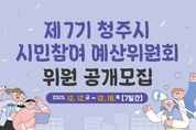 [한국기자연대] 청주시는 시민참여예산제의 효율적인 운영과 활성화를 위해 오는 18일까지 제7기 청주시 시민참여예산위원 14명을 공개모집한다. 시민참여예산위원회는 예산에 대한 시민들의 의견을 수렴·집약하고 수립 과정에 참여해 예산안에 대한 의견을 제출하는 기능을 수행한다. 시민이 제안한 사업에 대한 우선순위 결정, 추진 결과 점검 등 과정 전반에 직접 참여하게 된다. 이번 공개모집 인원은 14명으로 읍·면 8명, 동 6명이다. 임기는 2026년 1월 1일부터 2027년 12월 31일까지 2년간이다. 신청 자격은 청주시에 주민등록이 되어 있거나 청주시에 영업소 본점 또는 지점을 둔 사업체의 대표자・임직원, 청주시 소재 기관·단체에 근무하는 사람 등이다. 세금 및 과태료 체납자는 신청할 수 없다. 신청은 시 누리집 고시공고에서 신청서를 내려받아 18일까지 시 예산과, 구청 행정지원과, 읍·면·동 행정복지센터에 방문하거나 이메일, 우편 등을 통해 제출하면 된다. 시는 연말까지 선정해 개별통지할 계획이다. 시 관계자는 “투명하고 효율적인 예산운영을 위한 시민