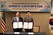 [한국기자연대] 제주특별자치도가 미국 동부 50만 한인을 대표하는 뉴욕한인회와 손잡고 경제·관광·문화·교육 분야 글로벌 협력 네트워크를 본격 가동한다. 제주도는 19일 오후 4시(현지시간) 미국 워싱턴DC 소재 하얏트 플레이스 호텔에서 뉴욕한인회와 상생 교류발전 업무협약을 체결했다. 뉴욕한인회는 뉴욕 대도시권과 뉴저지, 코네티컷 일부 지역 약 50만 한인을 대표하는 비영리단체로 한인 권익보호와 문화·경제·교육·복지사업, 이민자 지원 등을 담당한다. 제주도가 미주지역 한인회와 협약을 맺은 것은 지난해 10월 미주한인회총연합회에 이어 두 번째다. 협약식에는 오영훈 지사와 이명석 뉴욕한인회장을 비롯한 양측 관계자 20여 명이 참석해 다양한 분야에 대한 구체적인 협력방안을 논의했다. 주요 내용은 △제주형 휴가지 원격근무(워케이션)·배움여행(런케이션) 프로그램 홍보 및 참여 촉진 △관광·지역경제 활성화를 위한 네트워크 협력 사업 △협약기관 간 지속가능한 공동체 발전 및 상생 기반 마련 등이다. 오영훈 지사는 “뉴욕한인회와의 업무협약은 한인사회 발전과 고국 연결을 강화하는 계기”라며