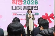 [한국기자연대] 안성시는 12월 4일 경기 사회복지공동모금회와 함께 ‘희망 2026 나눔캠페인’ 행사를 열고, 연말연시 따뜻한 나눔 분위기 확산에 나섰다. 이날 행사에는 김보라 안성시장을 비롯하여 경기 사회복지공동모금회 김효진 사무처장 및 관계자, 그리고 지역 내 주요 기부 참여 기업인 ㈜그랜드썬기술단에스피, 한솔아이원스(주), ㈜삼양컴텍, 한일크린에너지(주), 골프클럽큐레저산업(주) 등 기업인들이 함께해 자리를 빛냈다. ‘희망 2026 나눔캠페인’은 2025년 12월 1일부터 2026년 1월 31일까지 두 달간 진행되며, 안성시의 모금 목표액은 5억 원이다. 시민과 지역 기업이 정성으로 모은 성금과 물품은 관내 어려운 이웃에게 전달될 예정이다. 행사 주요 내용으로는 캠페인 소개를 시작으로 ‘사랑의 온도탑 제막식’과 ‘명사 열매달기’ 행사가 진행됐으며, 이어 기부금(품) 전달식이 열려 본격적인 나눔캠페인의 출발을 알렸다. 김보라 안성시장은 “이번 ‘희망 2026 나눔캠페인’을 통해 따뜻한 나눔의 가치가 지역사회 전반에 퍼지길 바란다”며 “시민 모두가 동참해 어려운 이웃과 온정을 나누는 시간이 되기를