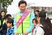 [한국기자연대] 이상일 용인특례시장은 14일 아침 처인구 고림로에 위치한 고진초등학교 정문 횡단보도에서 어린이들의 안전한 통학환경 조성을 위한 교통지도 봉사활동에 참여하고 학교 주변 통학로를 점검했다. 이상일 시장은 서경란 고진초 교장, 녹색어머니회·학부모회·학생 등 60여명과 함께 등굣길 어린이들이 안전하게 길을 건널 수 있도록 돕고 운전자들에게 ‘어린이보호구역 내 서행’을 당부하는 교통안전 캠페인을 펼쳤다. 이 시장은 통학로 현장을 둘러보며 ▲고림고 유리방음벽 모서리 보호대 설치 ▲고림고~힐스테이트용인고진역 구간 횡단보도 너비 확대 ▲해당 구간 도로의 물고임 등 도로시설물 일제정비 ▲통학로 낙엽제거(보행자 미끄러짐 방지) 등의 추가 건의사항을 꼼꼼히 챙겼다. 이상일 시장은 녹색어머니회와 학부모회 회원들에게 “아이들의 등굣길을 지켜주셔서 감사 드린다”며 “학생들이 마음 놓고 통학할 수 있는 안전한 도시 환경을 만드는 것이 무엇보다 중요한 만큼 시에서도 현장을 잘 살펴 필요한 조치를 신속히 진행하겠다”고 말했다. 이 시장은 10월과 11월에도 용인신촌초, 백현초, 구갈초, 신월초, 함박초, 교동초,