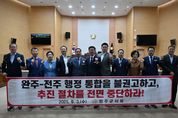 [한국기자연대] 완주군의회는 3일 제295회 임시회 제1차 본회의에서 서남용 의원이 대표 발의한 ‘완주-전주 행정통합 불권고 및 추진절차 전면 중단 촉구 결의안’을 만장일치로 채택했다. 이번 결의안은 완주군민의 압도적 반대에도 불구하고 전북자치도와 전주시가 일방적으로 추진 중인 행정통합 논의의 문제점을 지적하고, 관련 절차의 즉각 중단을 요구하는 내용을 담고 있다. 서남용 의원은 결의안을 통해 ▲완주군민의 뜻을 무시한 통합 논의 지속 ▲군정 안정성 및 행정력 낭비 ▲주민 간 갈등과 사회적 분열 심화 등을 문제점으로 지적했다. 이어 행정안전부 장관에게 통합 불권고 결정을 촉구하고, 전북자치도와 전주시에 절차 중단과 군민 사과를 요구하며, 정부에는 지역 균형 발전을 위한 실질적 정책 마련을 촉구했다. 완주군과 전주시 간 행정통합 논의는 이미 1997년, 2009년, 2013년 세 차례 추진됐으나, 모두 완주군민의 압도적 반대로 무산된 바 있다. 최근 여론조사에서도 완주군민의 약 71%가 통합에 반대하는 것으로 나타났으며, 찬성 측 단체 조사에서도 66%가 반대 의견을 보였다.