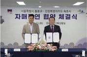 [한국기자연대] 종로구는 9월 23일 구청 기획상황실에서 속초시와 자매결연을 맺었다. 이로써 두 도시는 교육·문화·관광을 비롯해 재난 대응까지 다양한 분야에서 교류와 협력을 강화할 방침이다. 협약 주요 내용은 ▲우수 정책 공유 및 벤치마킹 ▲농수산물 직거래 장터 참여와 전통시장 교류 ▲대표 축제 및 기념식 상호 방문 ▲자매도시 주민 관광지 할인 협의 ▲지역 특색 체험 프로그램 상호 초청이다. 이날 협약식에서 종로구는 북촌전통공방협의회 소속 보석공예 명인 남송 김상실 선생의 자개보석 궁중채화를, 속초시는 동해와 설악산, 크루즈 풍경을 담은 도판화 작품을 교환해 의미를 더했다. 정문헌 구청장은 “종로와 속초가 상호 발전의 동반자로 나아가는 중요한 출발점이 될 것”이라며 “주민 행복 증진과 지역경제 활성화를 위한 다양한 협력 사업을 추진하겠다”라고 밝혔다.