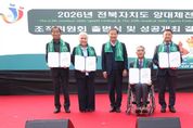 [한국기자연대] 진안군은 5일 군청 광장에서 2026년 개최 예정인 전북자치도 양대체전의 성공적인 개최를 다짐하는 조직위원회 출범식 및 성공개최 결의대회를 열었다. 이번 행사는 진안군 역사상 최초로 개최되는 제63회 전북특별자치도민체육대회(2026. 9. 4.~9. 6.)와 제20회 전북특별자치도민장애인체육대회(2026. 9. 18.~9. 20.)의 성공 개최를 위해 마련된 자리로 2026년 전북자치도 양대체전 조직위원, 범군민참여위원, 진안군민 등 약 500여 명이 참석했다. 행사는 식전공연을 시작으로 ▲조직위원 위촉장 수여 ▲기념사 및 축사 ▲준비상황 보고 ▲결의문 낭독 ▲성공개최 퍼포먼스 순으로 진행됐다. 이날 결의대회에서는 ‘생태치유 진안에서 하나되는 전북도민’을 슬로건으로, 군민 모두가 주인이 되는 대회를 만들겠다는 다짐이 이어졌다. 행사 후에는 체전 성공개최를 염원하는 ‘군민 걷기행사’가 이어져 출범식 분위기를 한층 고조시켰다. 특히, 진안군은 이번 대회를 인근 지역과의 긴밀한 협력체계 구축과 체육 인프라 확충 노력을 통해 성사시켰다는 점에서 주목받고 있다. 이는 지역 간 상생과 연대의