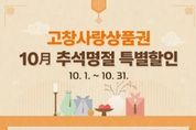 [한국기자연대] 고창군이 추석을 맞아 군민 생활안정과 지역경제 활성화를 위해 ‘고창사랑상품권 특별할인 행사’를 진행한다. 이번 행사는 10월 한 달간 진행된다. 이번 특별할인은 △상품권 구매시 10% 선할인 △고창사랑카드 결제시 10% 캐시백 적립을 통해 최대 20% 혜택을 받을 수 있도록 구성됐다. 특히, 월 구매한도를 100만 원까지 확대해 군민들의 혜택을 더욱 강화했다. 예를 들어, 10만원 상품권 구매 시 10%(1만 원) 선할인을 적용받아 9만원에 구매하고, 이후 고창사랑카드로 결제하면 결제금액의 10%가 캐시백으로 적립돼 실질적으로 최대 20% 혜택을 누릴 수 있다. 다만, 선할인(10%)이 적용된 금액은 캐시백 적립 대상에서 제외된다. 심덕섭 고창군수는 “이번 추석 명절 특별 할인을 통해 군민들께는 생활비 부담을 덜어드리고, 지역 소상공인들에게는 매출 증대 효과가 기대된다”며 “특히, 군에서 지급하는 군민활력지원금과 정부의 민생소비쿠폰이 더해져 군민 모두가 더욱 넉넉한 추석 명절을 보내시길 바란다”고 밝혔다. 한편, 고창사랑상품권은 전통시장과 지역 내 가맹점에서