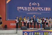 [한국기자연대] 경상북도는 22일 영주시 풍기인삼문화팝업공원에서 민족통일협의회 경상북도 주관으로 ‘2025 민족통일 경상북도대회’를 개최했다. 행사에는 김진현 경북도 안전행정실장, 배진석 도의회 부의장, 유정근 영주시장권한대행, 도재영 민족통일 중앙협의회 의장, 박종호 민족통일경상북도협의회장, 김추길 민족통일 전남회장을 비롯한 시군지회 회원 700여 명과 풍기인삼축제현장을 찾은 많은 관광객과 어울려 뜻깊은 행사를 했다. 행사는 식전 공연을 시작으로, 한반도 평화를 위한 결의문을 회원들과 함께 낭독하고, 이어서 지역사회 및 통일 안보에 이바지한 우수 유공자들에게 도지사 표창을 비롯한 다양한 상패가 수여되며 행사 분위기를 한층 고조시켰다. 특히, 행사 마지막에는 참가자 전원이 함께 ‘우리의 소원은 통일’을 합창하며, 평화통일의 필요성과 중요성을 다시 한번 되새기는 뜻깊은 시간으로 마무리됐다. 박종호 민족통일 경상북도협의회장은 대회사를 통해 “확고한 국가관과 투철한 사명감을 바탕으로 민족의 염원인 조국의 평화통일을 실현할 수 있도록 도민들의 적극적인 참여와 성원”을 당부했다. 김진현 경북도