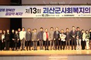 [한국기자연대] 충북 괴산군은 29일 괴산군 문화예술회관에서 ‘제13회 괴산군 사회복지의 날 기념행사’를 개최했다고 밝혔다. 이번 행사는 괴산군사회복지협의회(회장 고명성) 주관으로 열렸으며, 송인헌 괴산군수를 비롯한 사회복지시설 종사자 등 200여 명이 참석한 가운데 사회복지인의 노고를 격려하고 화합을 다지는 자리로 마련됐다. 행사는 장연지역아동센터 합창단의 식전공연을 시작으로, 괴산군사회복지협의회 회장 이·취임식, 유공자 표창, 인사말, 퍼포먼스 순으로 진행됐다. 이날 이·취임식에서는 최은묵 전 회장에 이어 고명성 신임 회장이 취임했으며, 유공자 표창 수여식에서는 지역 사회복지 증진에 기여한 12명이 표창을 받았다. △군수 표창은 배기만(괴산지역자활센터), 이정자(성제노의집), 심서경(괴산재가복지센터), 이충정(괴산군노인복지관), 안미경(청천재활원), 천병주(수달지역아동센터), 이봉우(햇살재가복지센터), 이정민(괴산군 가족행복과) 등 8명이 수상했다. △군의장 표창은 신미경(괴산지역자활센터), 이만형(청천재활원) 등 2명, △괴산군사회복지협의회장 표창은 조경옥(청주사랑나눔기초푸드뱅크)